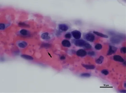 Babesia canis í rauðum blóðkornum: Smásjármynd af æð með fjölda rauðra blóðkorna (rauður litur) og annarra blóðfruma (fjólublár litur). Innan rauðu blóðkornanna má sjá Babesia canis sníkjudýrið (dæmi sýnt með ör).