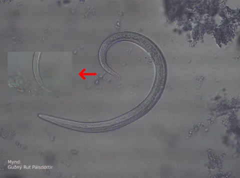 Notast var við Baermann botnfellingaraðferð, sem er beint sérstaklega að hjarta- og lungnaormalirfum. Skoðun sýnisins leiddi í ljós talsverðan fjölda fyrsta stigs lirfa tegundarinnar A. abstrusus. Lirfurnar eru um 310 – 400 µm að lengd og hafa sérkennilega, en einkennandi, lögun á afturenda, boginn með hak og baklægan brodd (sjá mynd hér að neðan. Mynd: Guðný Rut Pálsdóttir).