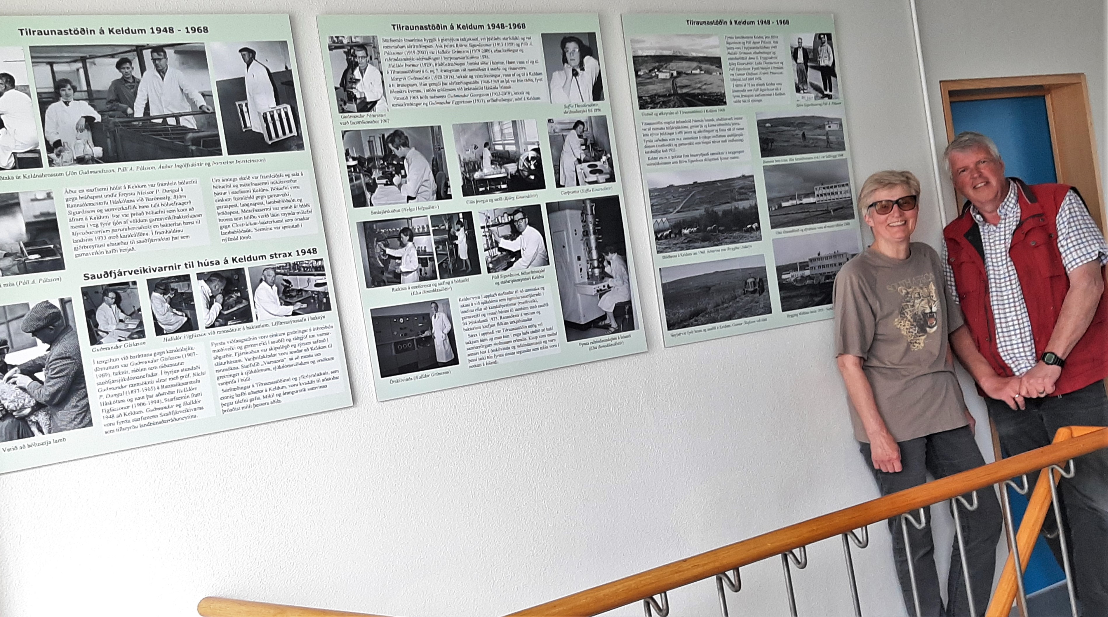 Veggspjöldin hanga uppi í húsnæði Tilraunastöðvarinnar og þau má líka skoða hér í þessum tengli. Hér að neðan má sjá Sigurbjörgu og Karl við veggspjöldin þar sem þau hanga í anddyri Keldna.