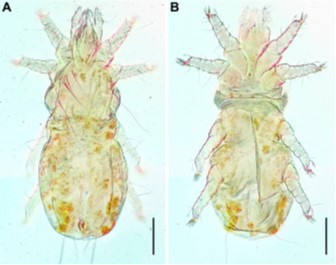 Hér að neðan má sjá mynd af fjaðurstafamítlinum sem Maciej Skoracki tók og sýnir hún karlmítil ofan- og neðanfrá.